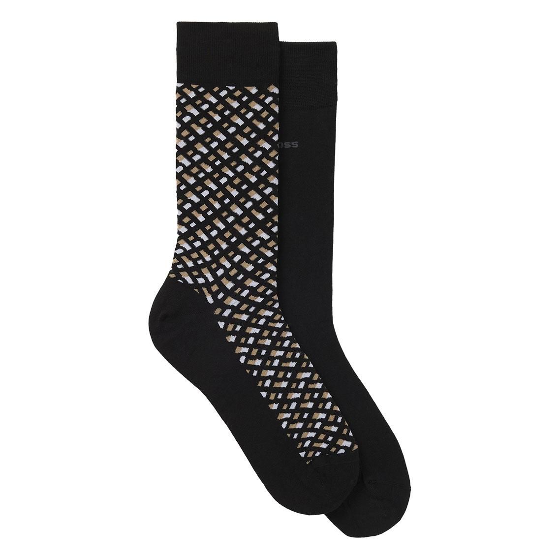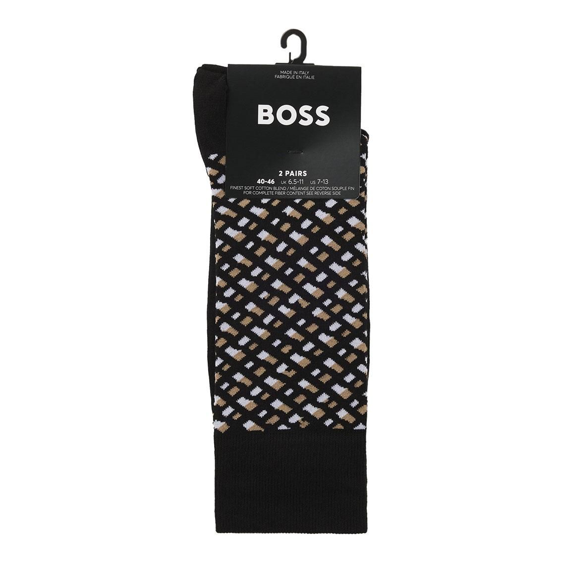 BOSSの無地とモノグラム入りソックス2足セット。レギュラー丈で、ストレッチ性のあるコーマ綿混紡素材を使用。
